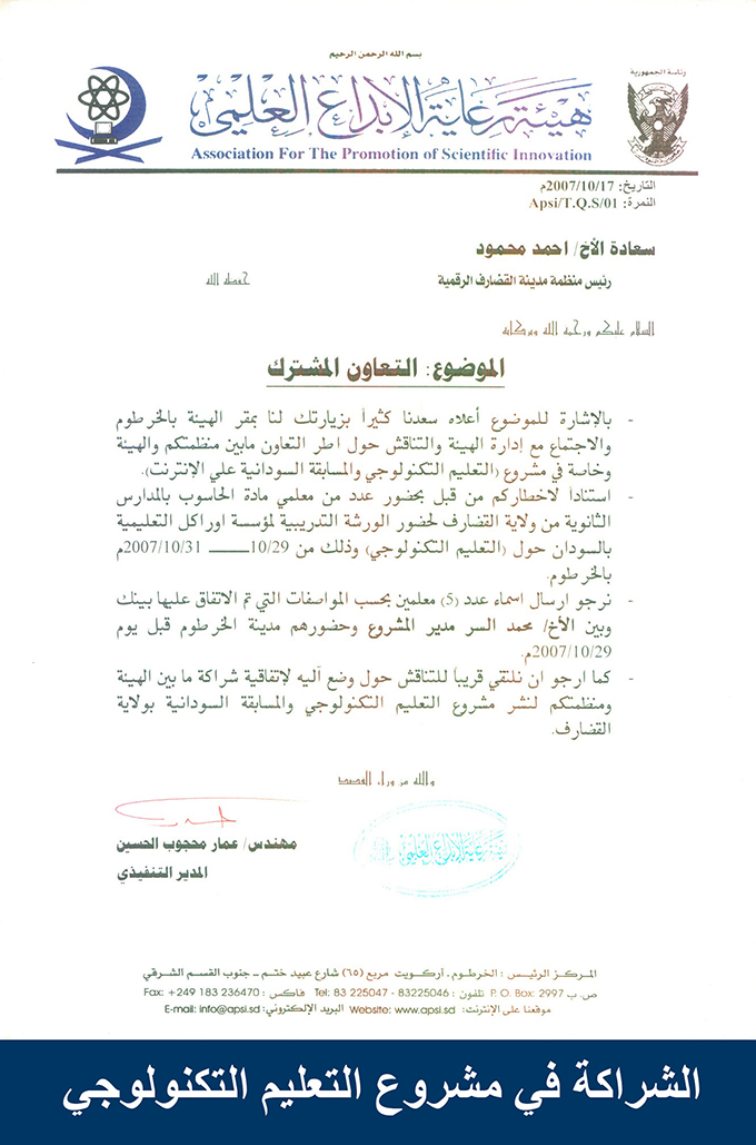 - في 17 اكتوبر 2007 بدات العلاقة بين هيئة رعاية الابداع العلمي ومنظمة القضارف الرقمية في مشروع التعليم التكنولوجي والمسابقة السودانية علي الانترنت